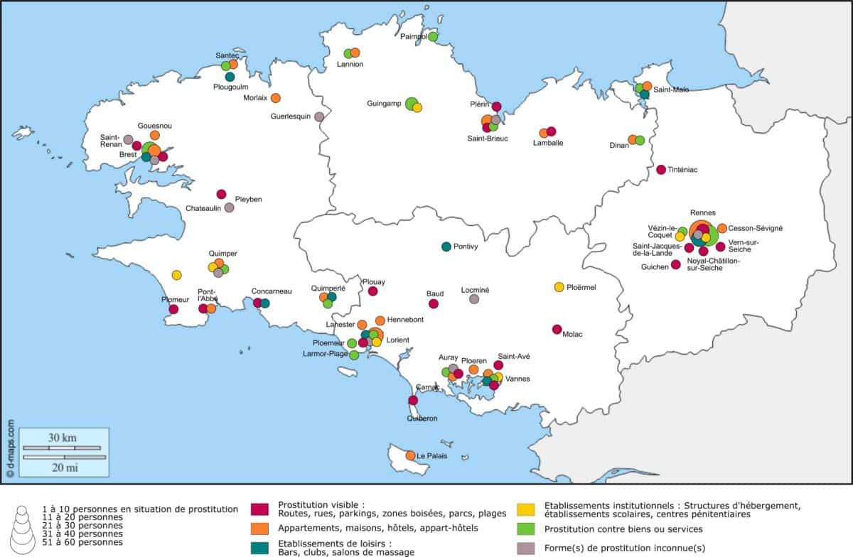En 2017-2018, la Direction régionale aux droits des femmes et à l’égalité entre les femmes et les hommes (DRDFE) de Bretagne a mandaté l’association l’Amicale du Nid afin d’établir un diagnostic de la prostitution dans les quatre départements bretons. Un état des lieux sur les trois dernières années a ainsi été réalisé entre mars 2018 et octobre 2019 via le prisme d’acteurs de terrains (questionnaire en ligne et entretiens semi-directifs) et des annonces Internet.