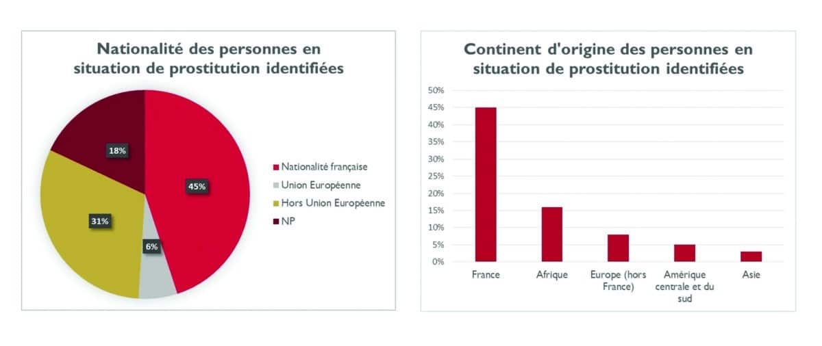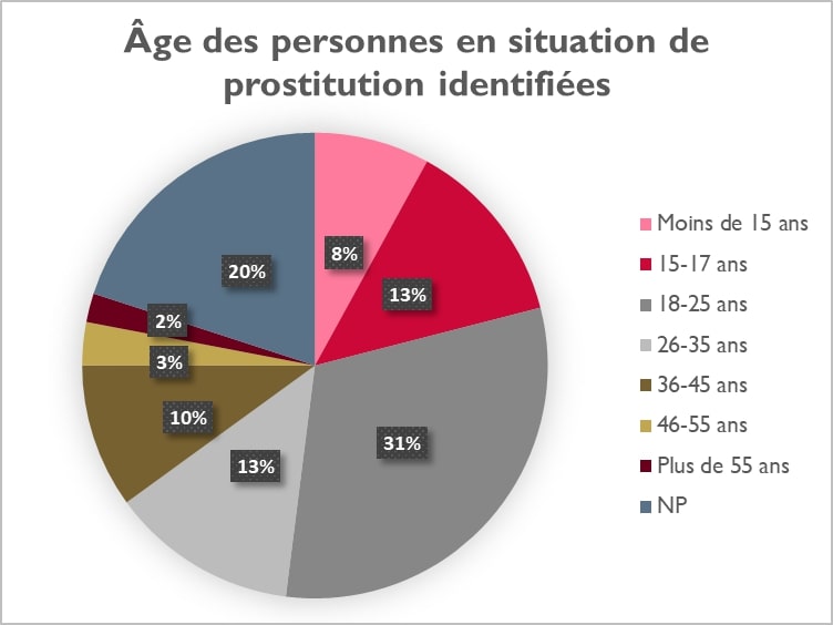 Sur les 661 personnes en situation de prostitution probable ou avérée, la majorité s’avère féminine à 87 % (573). Cependant, on dénombre 11 % (74) d’hommes et 2 % (14) de transidentitaires. Bien que la prostitution soit en grande partie une violence faite à l’encontre des femmes, les chiffres en hausse de la prostitution masculine, souvent absente du débat, ne sont pas à négliger.