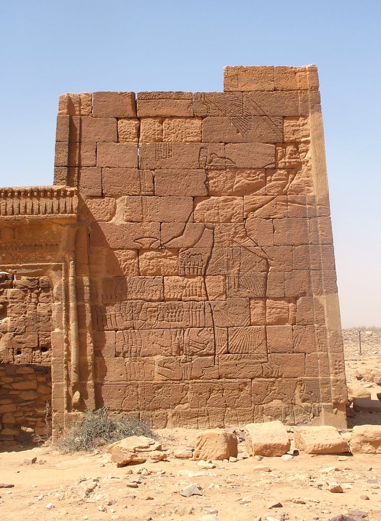 La candace Amanitore figurée en train de massacrer ses ennemis, façade du temple de Naqa, Soudan. Wikipedia